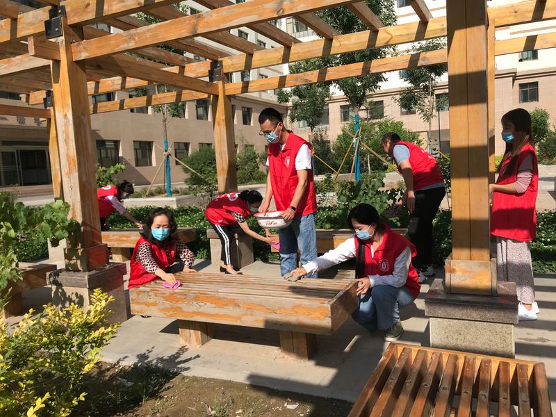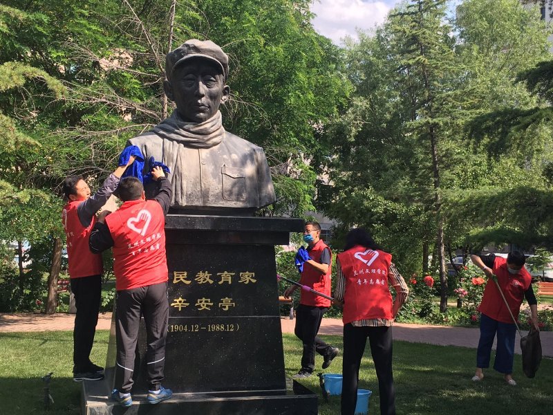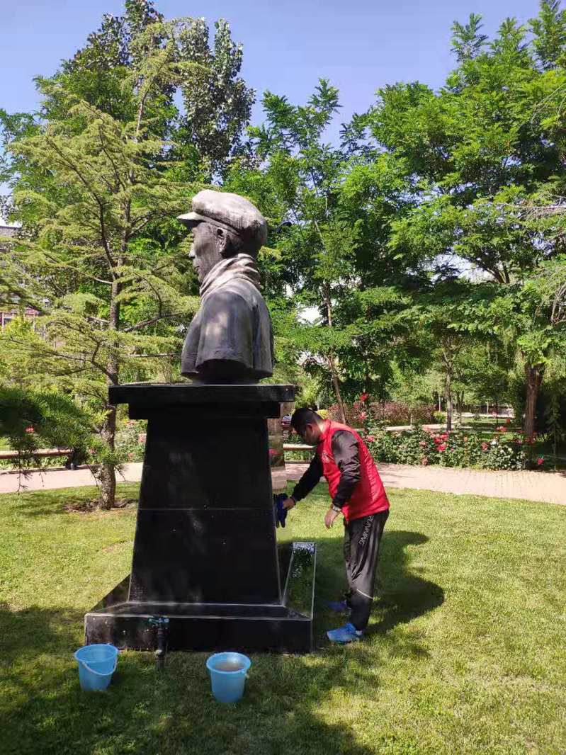 各支部党员利用工余时间,身着志愿者红马甲,自备清洁工具,在学校安亭广场、天桥、花园、草坪等区域,对辛安亭雕像、天桥围栏、花园的长凳进行清洗擦拭。对校园草坪、公共区域的废弃垃圾进行了认真清捡,大家不放过任何细节,一个烟头、一张废纸、一个塑料瓶都被清理干净,经过党员志愿者共同努力,校园环境得到进一步净化美化。