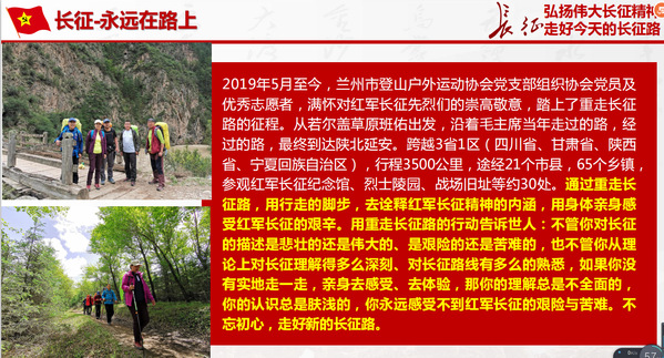 会上,阙银海为大家介绍了他们团队重走长征路活动的起因、活动的延续时间、活动的进展情况和活动的收获等概况。同学和老师们集体观看了团队重走长征路的纪实视频,大家看到真实的团队用脚步走过了四川、甘肃段长征路,徒步300多公里,一路上气候的多变,风霜雨雪的裹挟向前,和沿路百姓的促膝长谈,在每一处红军纪念碑前的深情缅怀,这些画面深深打动了每一位观众。