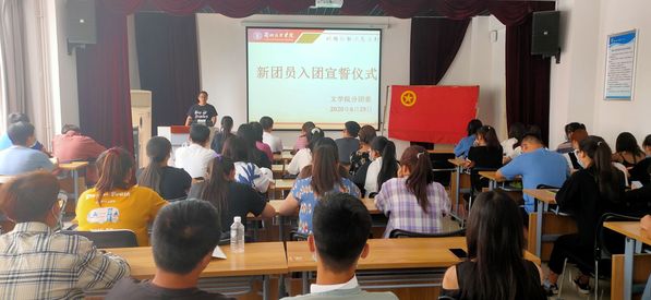 在庄严的国歌声中,入团仪式以学院分团委为单位逐次开展。主持人宣读新团员名单,老团员代表在鲜红的团旗下为新团员佩戴团徽、颁发团员证。由各学院分团委副书记领誓,新团员们面向团旗、举起右手庄严宣誓。青春的誓言,表达了同学们对共青团组织的向往和为团组织增光添彩的决心。随后入团介绍人代表宣读《团章》中有关团员的义务和权利的条款,希望同学们在形式上入团、在思想上入团,坚定理想信念,牢记入团誓词,严格遵守团章,履行团员义务,做优秀的共青团员。最后,入团仪式在嘹亮的团歌声中落下了帷幕。