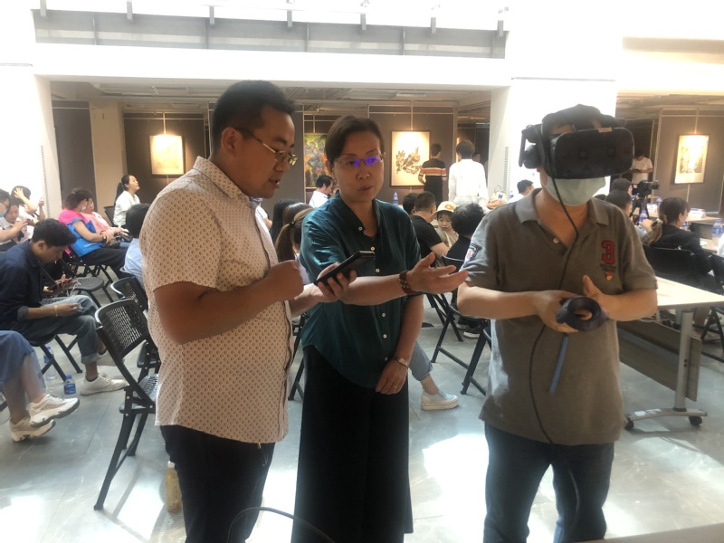 最后,陈小琴、马少斌与甘肃红色地标文化科技有限公司负责人就VR技术融入党建相关议题进行了深度交流,体验了该公司推出的 “VR+党建”作品,观看了具有高交互感和强沉浸性的“天安门广场阅兵”、“毛主席在延安文艺座谈会上的讲话”等历史场景,重温了党的历史。