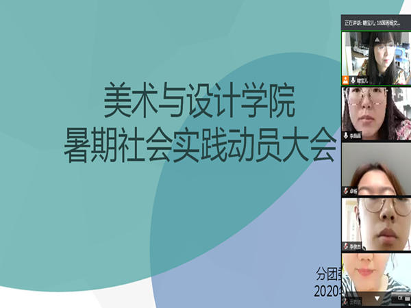 为动员学生积极参加社会实践,做好2020年暑期社会实践宣传工作,7月6日中午,美术与设计学院在腾讯会议召开了暑期社会实践动员大会,会议由团学办主任唐艳丽老师主持,辅导员郭子弘、李晶晶及全体学生干部参加。