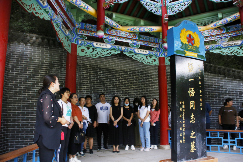 师生党员首先抵达张一悟纪念馆,由党总支书记陈小琴带领全体党员面向党旗重温入党誓词;讲解员对甘肃党组织创始人、中国共产党在甘肃的第一个组织——中共甘肃特别支部第一任书记张一悟同志的生平事迹进行了详细讲解,师生党员对张一悟同志为甘肃党组织建设、发展和马克思主义在甘肃的传播作出的重要贡献有了全面的了解,张一悟同志为党和人民的事业、为国家和民族的独立解放历经艰险、百折不挠的革命精神深深打动了在场的每一个人。