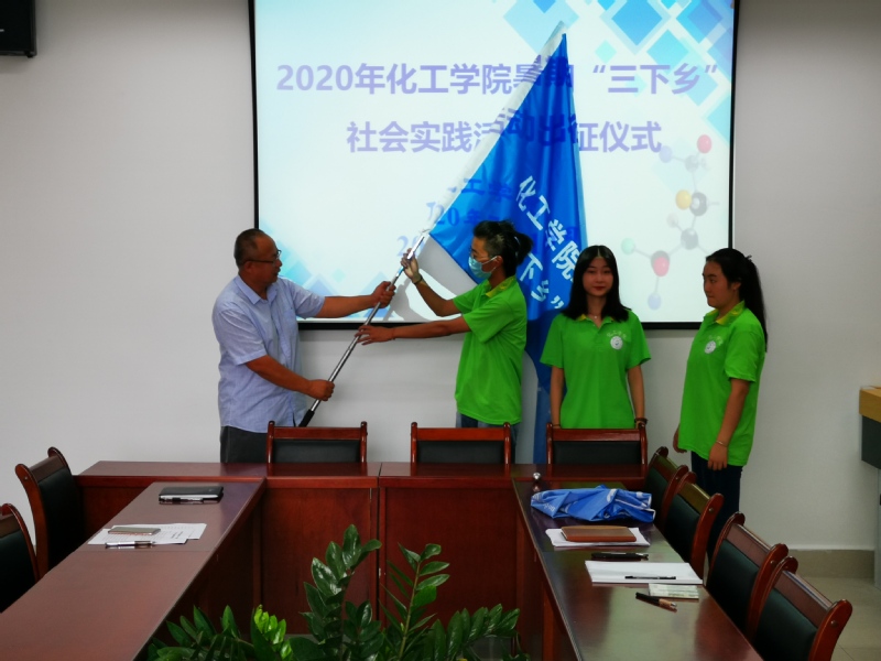会后,杨光为本次暑期社会实践活动三支团队授旗,化工学院2020年暑期“三下乡”社会实践活动正式开始。
