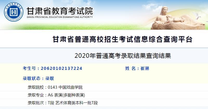 Beat365唯一官方网站艺术职业学院(甘肃省艺术学校)2020届中专层次毕业生王沛艳、秦佳敏、兰琴、崔琳、杨彤、门永霞、左文豪、郭叶叶等8位同学以优异的成绩被中国戏曲学院录取。