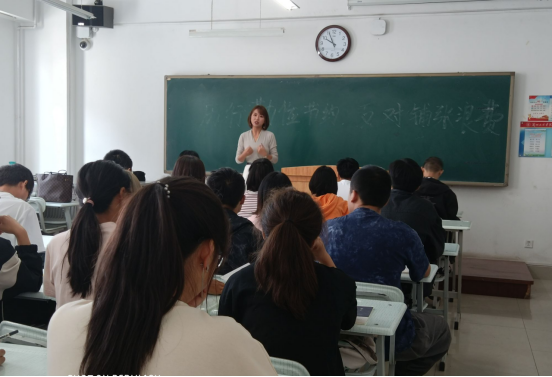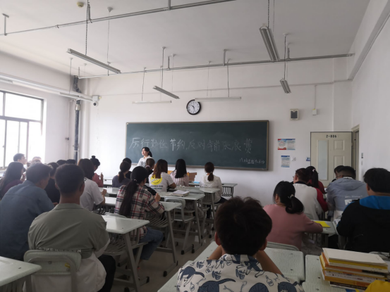 各班班主任以PPT讲解、观看短视频的方式,组织召开了形式多样、内容丰富的主题班会。班主任从党中央关于践行“厉行节约、反对浪费”的历程,向学生讲解党中央对于厉行勤俭节约的坚定决心和已取得的成效。告诫同学们一个人浪费一点粮食不显眼,但全社会加起来就是一个天文数字,餐饮浪费不是小事,事关我国粮食安全,事关社会道德风尚,事关良好作风养成,疫情敲响的警钟不允许我们有丝毫浪费的行为,勤俭节约,反对浪费贵在平时,重在坚持,希望同学们能珍惜当下来之不易的生活环境和学习环境。要求班委和学生党员作为学生中的标杆和领头羊,要做到以上率下,用自己节约的习惯与行动影响其他同学,起到榜样的作用。各班班主任倡议同学们在食堂用餐时,遏制“舌尖上的浪费”,践行“光盘行动”,按量所取,吃光盘子中的食物;用水时,坚决杜绝“长流水”现象;离开教室图书馆随手关灯,节约每一度电。