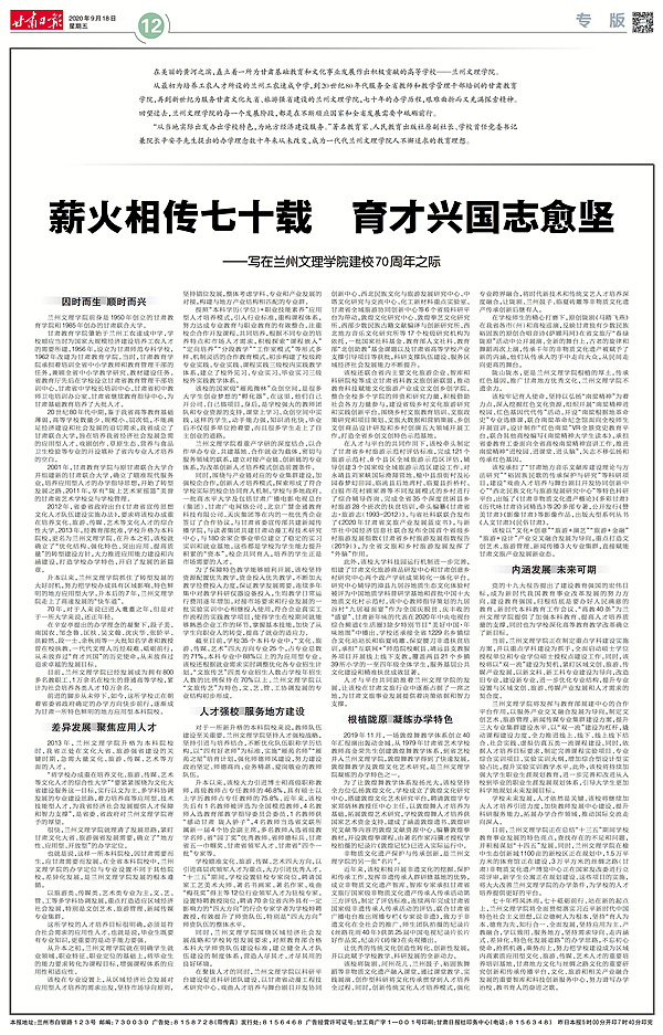 《甘肃日报》9月18日第12版专版刊登Beat365建校70周年校庆专题报道“薪火相传七十载 育才兴国志愈坚——写在Beat365唯一官方网站建校70周年之际”。