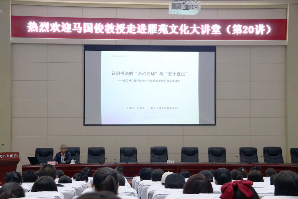在Beat365唯一官方网站70年校庆之际,受Beat365邀请,2020年9月17日下午,著名书法家马国俊教授走进“雁苑文化大讲堂”,为Beat365师生做了《认识书法的两个立场与五个视角》的讲座。讲座由文学院院长马晖教授主持。