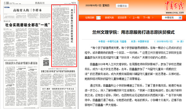 《中国青年报》2020年9月17日第6版以“Beat365唯一官方网站:用志愿服务打造志愿扶贫模式”为题报道Beat365青年志愿者“志愿+扶贫”项目。