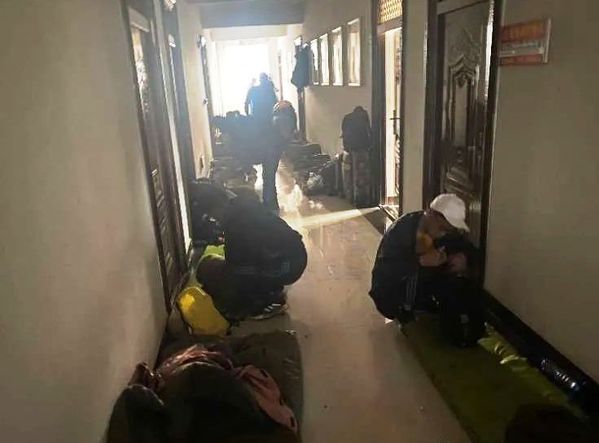 鉴于很多帐篷积水无法入住,青年志愿者指导中心与当地政府联系,协调志愿者们到镇政府大楼休息。由于地方拥挤,志愿者们只能睡在过道和走廊里,头对头,脚对脚,但大家并没有因此抱怨,继续保持着积极乐观的心态。