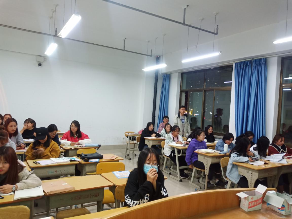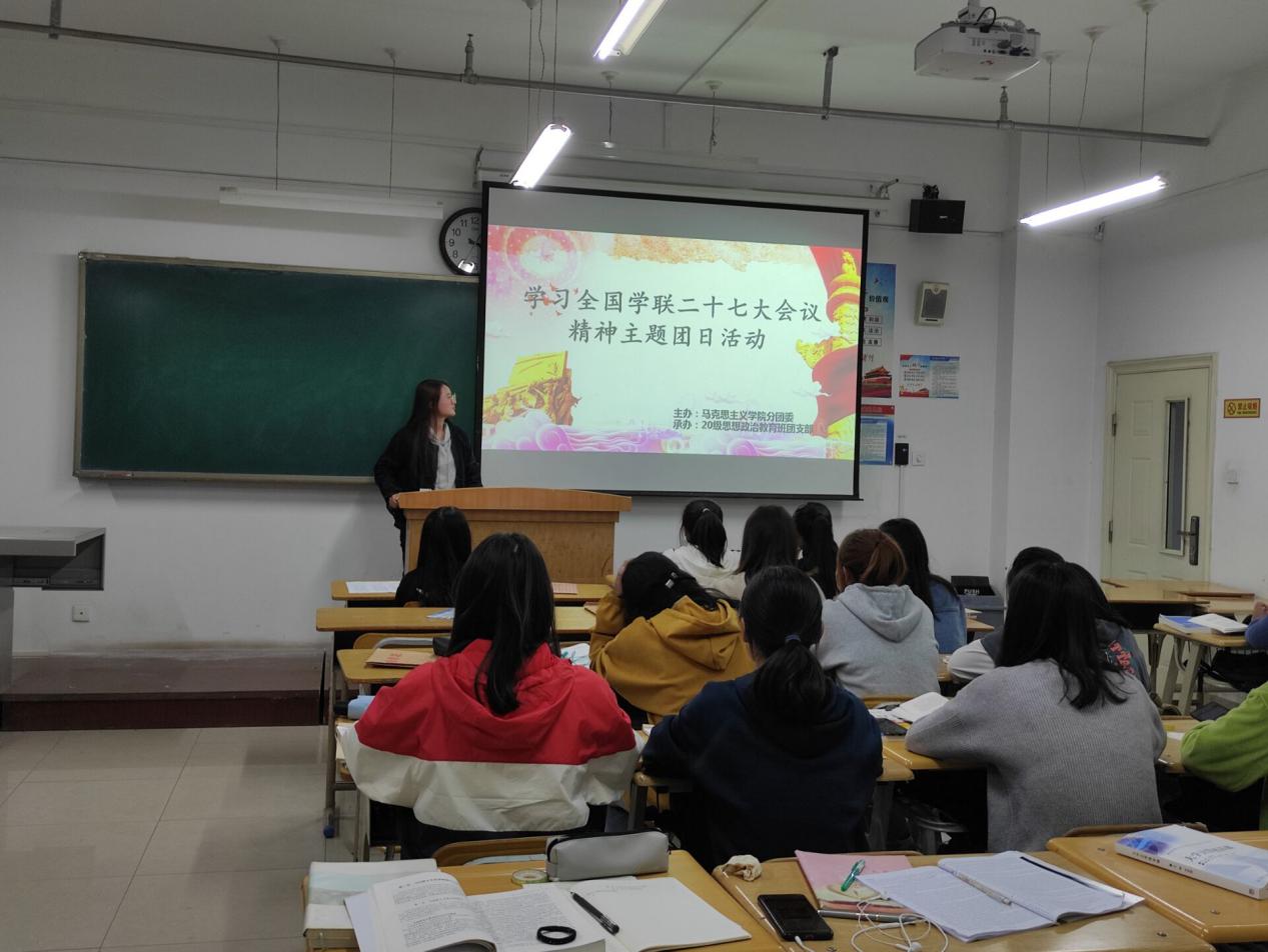 2020年10月12日晚,2020级思想政治教育班全体学生在3-303教室开展中华全国学生联合会第二十七次代表大会精神学习主题活动,本次活动由马克思主义学院分团委副书记米燕宁主持。