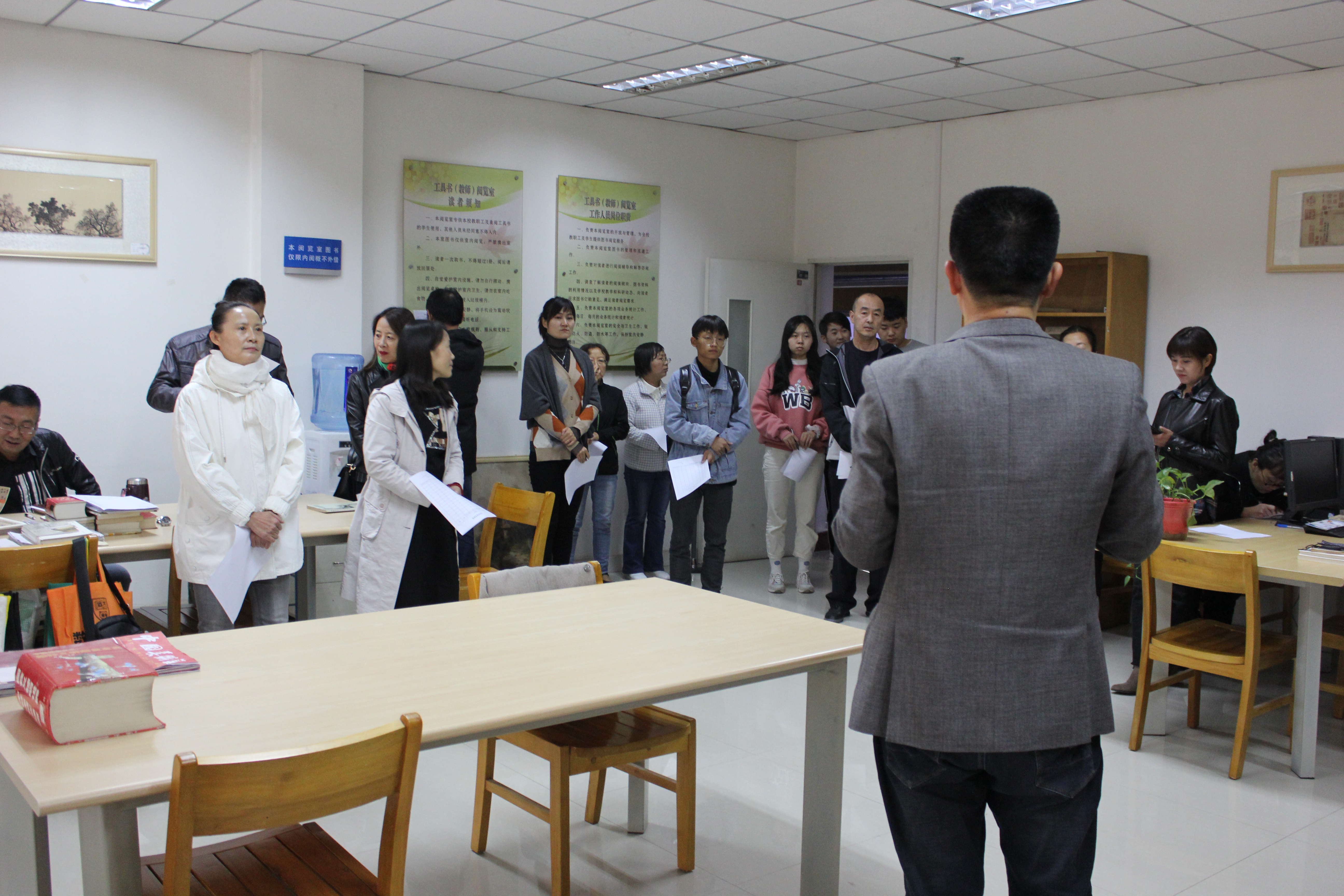 读者导读考核从态度、方法、内容、效果等4个方面进行,读者服务部工作人员,针对读者的学习需求,从馆藏布局、读者借阅规则、馆藏目录查询、读者开卡等方面现场介绍图书馆借阅服务工作。现场人员通过被考核人的现场讲解、答疑、仪容、仪表、规范用语等进行综合打分。