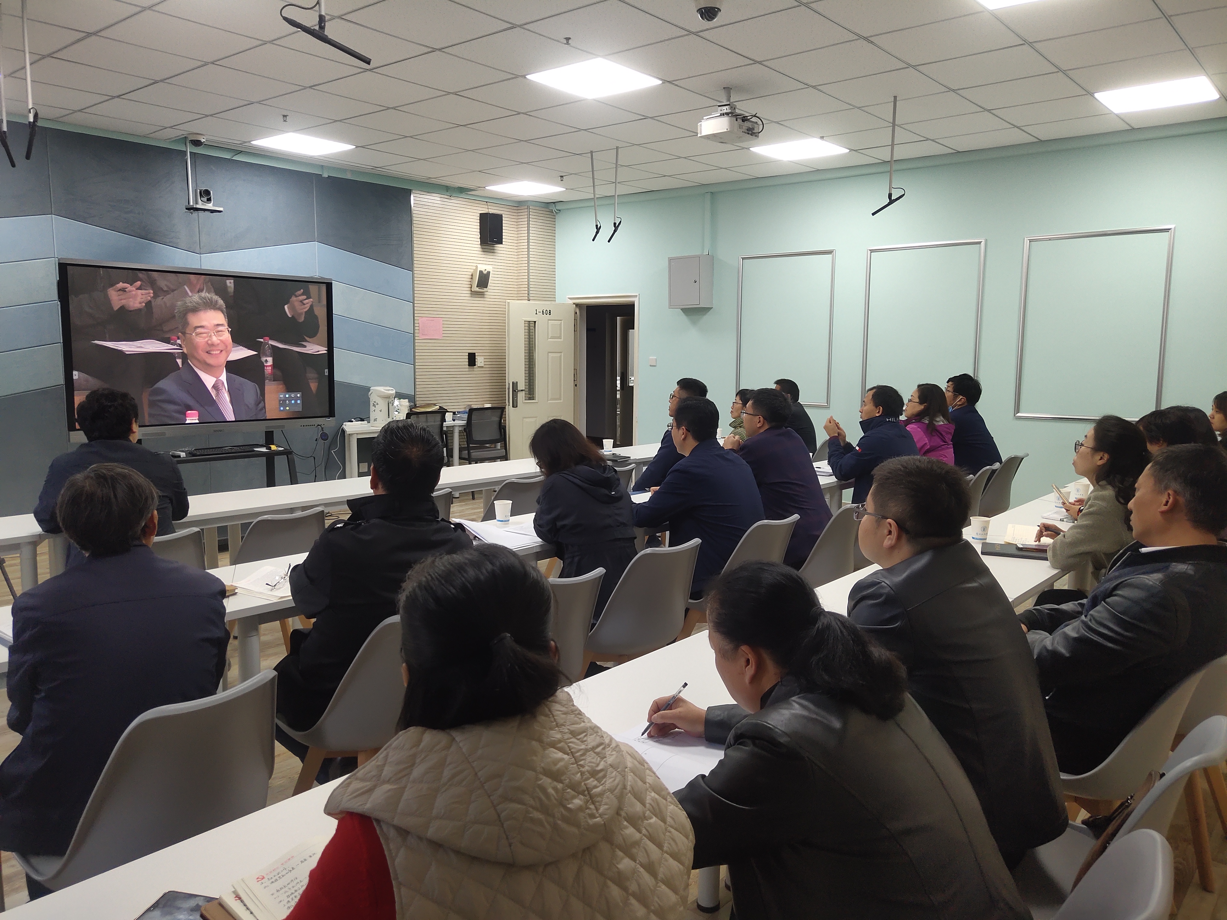 10月14日,教务处集中组织学习教育部高教司吴岩司长关于《谋大局 应变局 开新局——加快推进医学教育创新发展》的线上直播主题报告。教务处处长展惠英教授、副处长苑毅教授以及各二级学院院长、教学副院长、教研室主任等30余人在1-608智慧教室集体观看了远程视频报告。