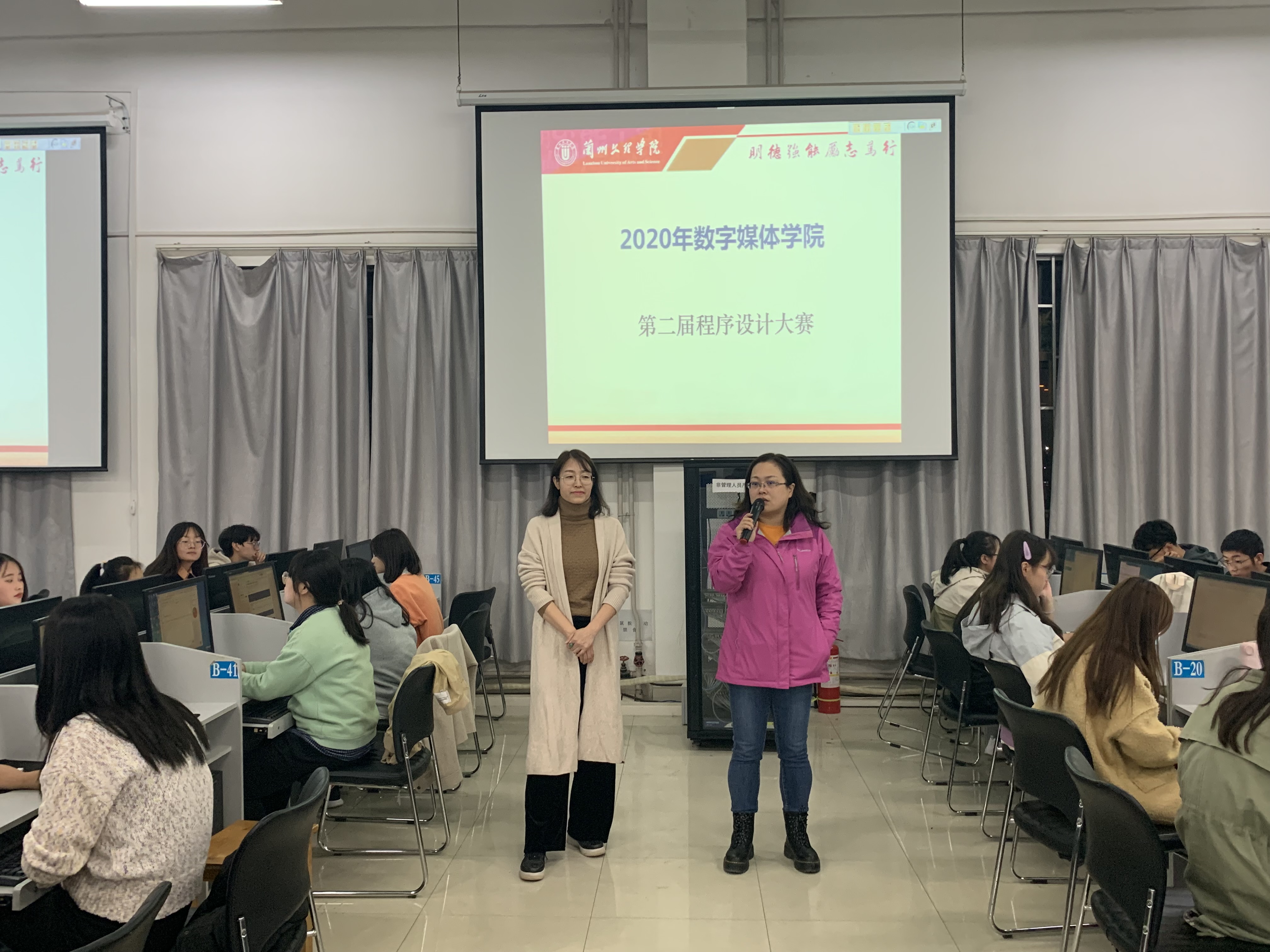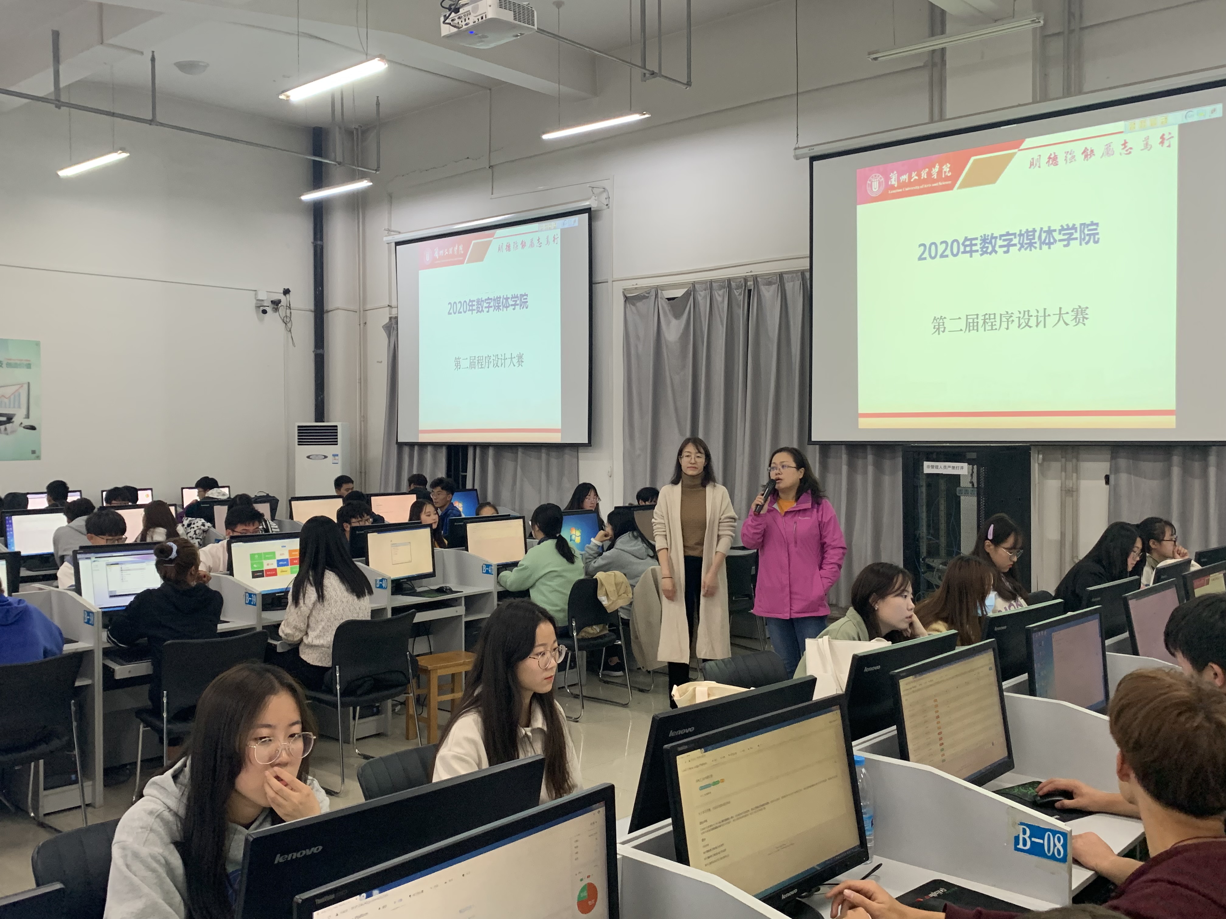 为进一步提高大学生综合素质和程序设计水平,提高学生的思维能力,动手实践能力,检验我院学生的程序设计能力,培养良好的学习交流氛围,帮助同学们提前适应如蓝桥杯、全国高校计算机天梯赛等校外程序设计比赛,数字媒体学院于2020年10月19日晚上7点30分在综合楼104机房举办“数字媒体学院2020年第二届程序设计大赛”,本次大赛共有一百多名同学参加,其中包括软件工程、数据科学与大数据技术、数字媒体技术各专业各年级学生。学院副院长黄珍、软件与大数据教研室主任张云、学院竞赛秘书刘瑒老师参加开赛仪式并分别讲话。