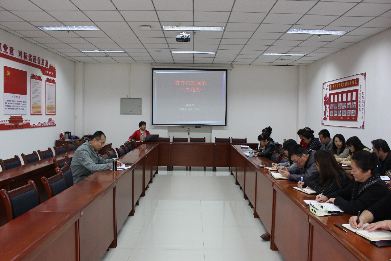 10月28日下午,图书馆在9楼会议室举办了“馆员论坛”活动,参考咨询部主任杨秀平教授作了题为《图书馆未来发展的十大趋势》的讲座。全体馆员参加了论坛活动,论坛由赵学森馆长主持。