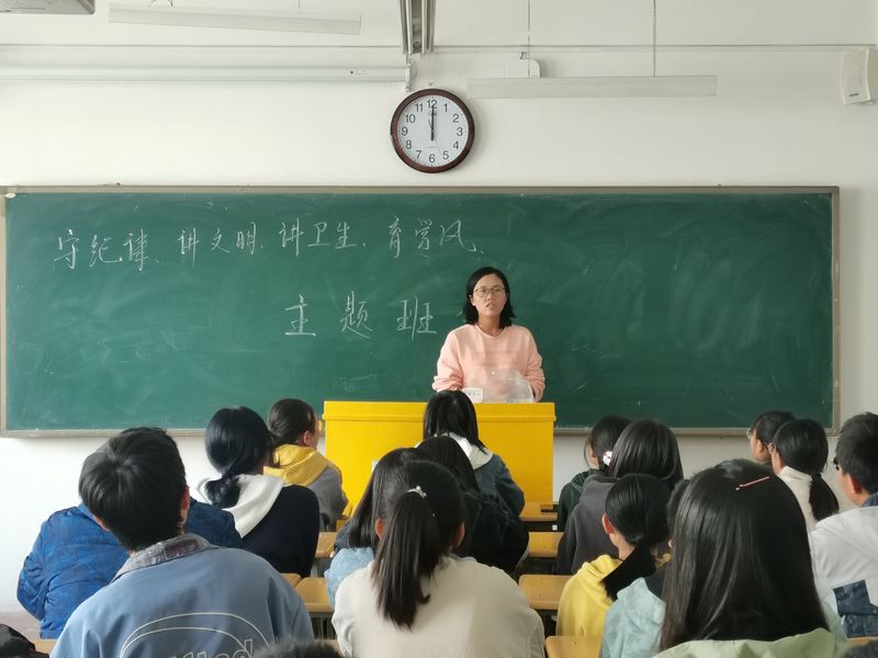 在主题班会上,各位班主任总结了课前十分钟宣讲活动的开展情况,希望同学们继续围绕身边的化学或者自己感兴趣的领域积极开展课前十分钟宣讲活动,提醒学生提前十五分钟,不带早餐零食进教室,充分利用好上课时间,认真听讲,学好专业知识;对学校督察队以及学院关于早课出勤情况、宿舍卫生的抽查情况进行通报,望同学们能严格遵守学校各项制度。班主任向同学们强调,要养成文明的言行,自觉抵制不文明行为,比如上下楼梯、乘坐电梯、食堂就餐时主动排队,见到教师主动问候,严禁在公共场合大声喧哗,垃圾入箱,养成良好的卫生习惯;在班主任们的带领下,同学们学习了宿舍管理相关制度,呼吁大家共同创造优美的宿舍环境。