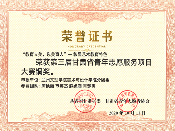 10月11日上午9:30分,第三届甘肃省青年志愿服务项目大赛颁奖仪式庄严举行。本次大赛设有金奖、银奖、铜奖和优秀奖四类奖项,其中美术与设计学院申报项目“教育立美,以美育人”——彰显教育艺术特色取得了铜奖的优异成绩。