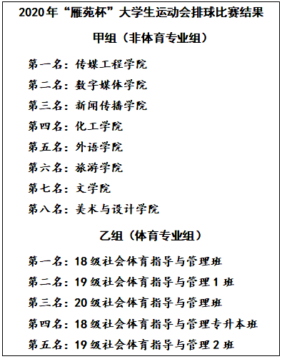 11月3日,经过十天小组赛、淘汰赛的激烈比拼,Beat3652020年“雁苑杯”大学生运动会排球比赛决赛在南校区第二运动场精彩上演。比赛分为甲组(非体育专业组)和乙组(体育专业组)。经过三局激战,传媒工程学院和18级社会体育指导与管理班两支队伍分别战胜了各自对手,赢得所在组别冠军。本届排球比赛结果出炉。
