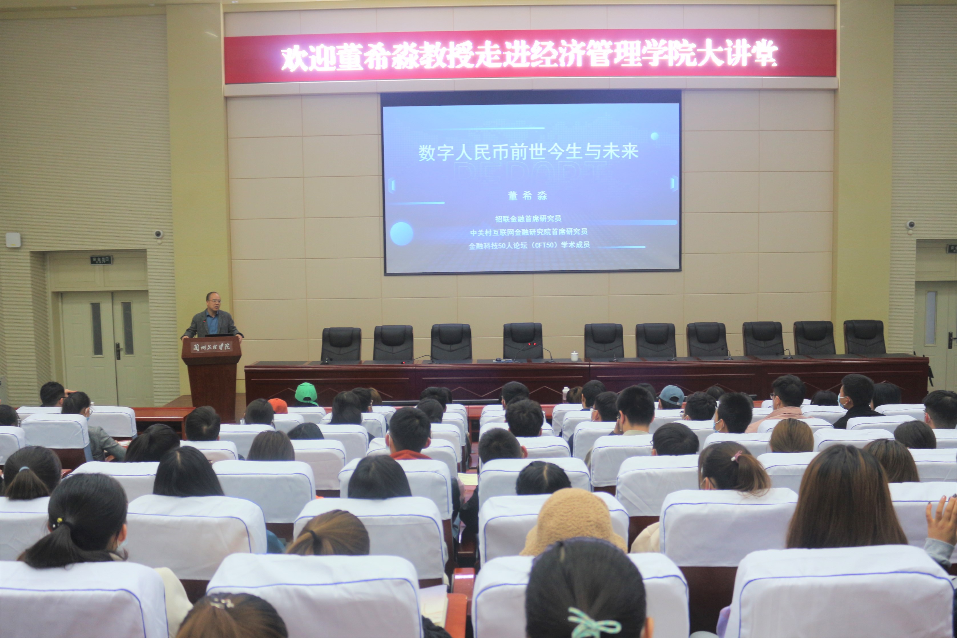 11月4日下午,中关村互联网金融研究院首席研究员、招联金融首席研究员、新网银行首席研究员董希淼应邀为经济管理学院近两百名师生代表做了题为“数字人民币的前世今生与未来来”的学术讲座。本次讲座由副校长刘畅主持。