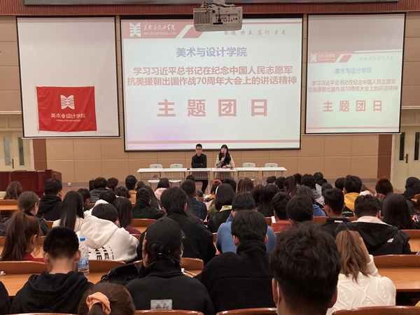 2020年11月10日,美术与设计学院在5-205教室,开展了“学习习近平总书记在纪念中国人民志愿军抗美援朝出国作战70周年大会上的重要讲话精神”主题团日活动,副院长李富红、分团委书记唐艳丽、辅导员陈怡舟、郭子弘以及全体学生干部参与活动。