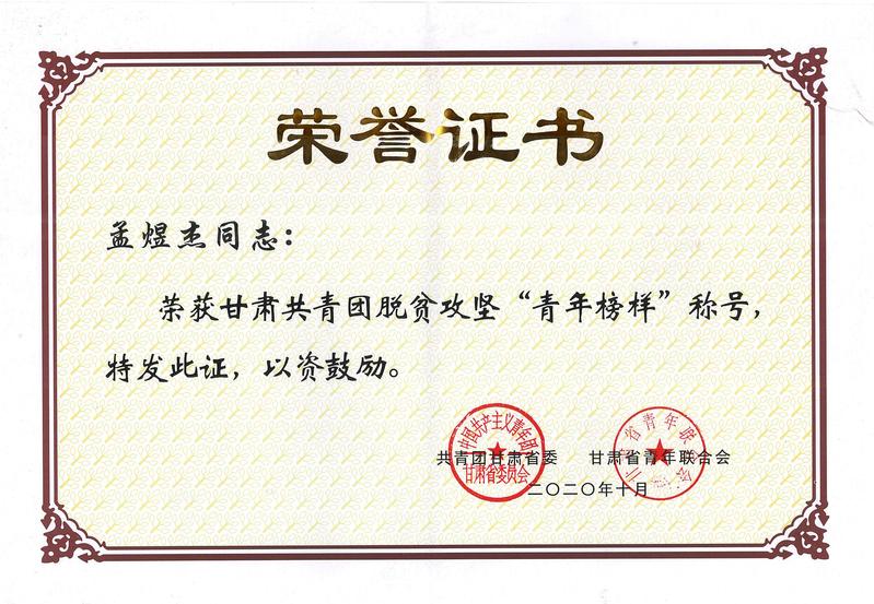 近日,团省委通报表扬了一批脱贫攻坚“青年榜样”先进典型。Beat365扶贫干部、文学院团学办主任兼分团委书记孟煜杰老师荣获甘肃共青团脱贫攻坚“青年榜样”称号。