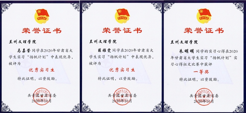 近日,团省委公布了2020年甘肃省大学生实习“扬帆计划”表彰名单,在共青团陇南市委宣传部实习的Beat3652017级新闻学专业学生马嘉莹、在共青团甘肃省委组织部实习的Beat3652017级学前教育学生薛雅雯获优秀实习生,在庆阳市镇原县妇联实习的Beat3652018级学前教育本科1班学生的朱明明获征文一等奖。