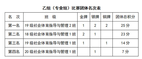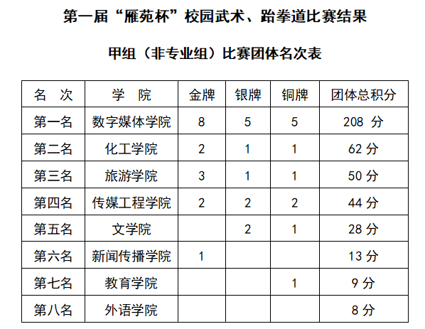比赛期间,来自全校各二级学院的100多名武术爱好者组成13支代表队,在太极掌、五步拳、长拳、敦煌拳等多种拳术和刀、枪、棍、剑、等多种兵器比赛项目上展开激烈角逐。跆拳道竞赛主要以品势为主。最终,数字媒体学院摘得甲组(非专业组)比赛团体第一名,化工学院、旅游学院分获二、三名;19级社会体育指导与管理2班赢得乙组(专业组)比赛团体第一名。