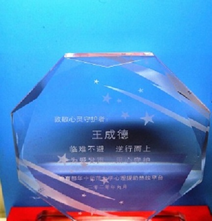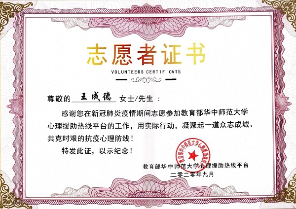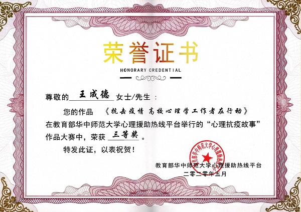 近日,Beat365心理健康服务中心主任、教育学院教工第二党支部党员王成德教授喜获教育部华中师范大学心理援助热线平台“优秀志愿者”称号,其报送作品《抗击疫情 心理学工作者在行动》在教育部华中师范大学心理援助平台举行的“心理抗疫故事”作品大赛中荣获三等奖,并收到了书写着:“致敬心灵守护者:临难不避 逆行而上 为爱发声 用心守护”的纪念品。
