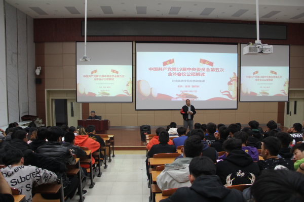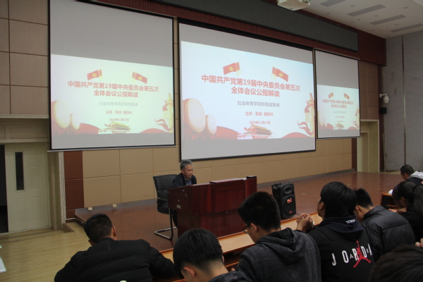 11月17日晚,张焱副校长给社会体育学院全体学生、部分教工讲形势政策课,解读《中国共产党第十九届中央委员会第五次全体会议公报》,社会体育学院党总支书记陆克珠教授主持。