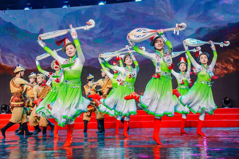舞蹈“情系裕鼓”在晚会上的呈现是通过绚丽的服饰,曼妙的舞姿、琴鼓悠杨地体现出裕固族独特的文化魅力和民族风情,表达了裕固族人民自强不息,积极向上、热爱家园的精神。