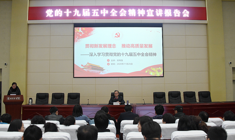 11月26日下午,校长郑伟强在学术报告厅为师生做了以《贯彻新发展理念 推动高质量发展——深入学习贯彻党的十九届五中全会精神》为题的宣讲报告暨“形势与政策”专题讲座。党委(学校)办公室、人事处、审计处、招生就业处全体工作人员,数字媒体学院全体教师、学生代表现场聆听。数字媒体学院党总支书记陈小琴主持宣讲会。