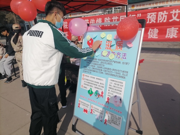 活动现场,同学们通过宣传手册了解、学习艾滋病预防的相关知识,在“携手防疫抗艾 共担健康责任”的倡议横幅上郑重地签下自己的名字,在系有红丝带的气球上写下自己的学习感言,在横幅上按下彩色掌印,踊跃参与艾滋病知识有奖竞答活动,并手举宣传牌合影留念。丰富多彩的活动吸引了来往的同学参与其中,尽管天气寒冷,但活动现场一派热火朝天的景象。