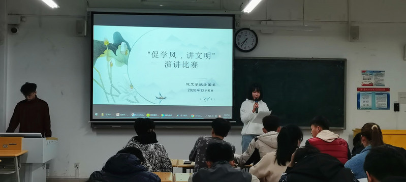 为宣传文明养成和学风建设的重要性,明确学习目的,端正学习态度,增强学生学习的内驱力,逐步形成良好的学风和校风,化工学院分团委于2020年12月6日晚在南校区3-704举办了“促学风,讲文明”主题演讲比赛。
