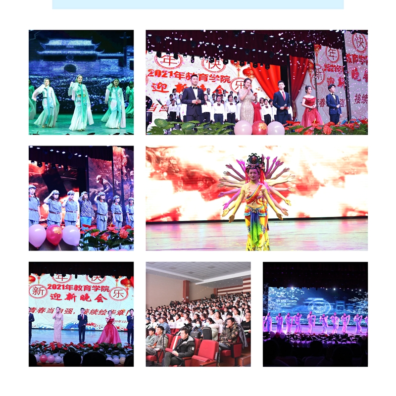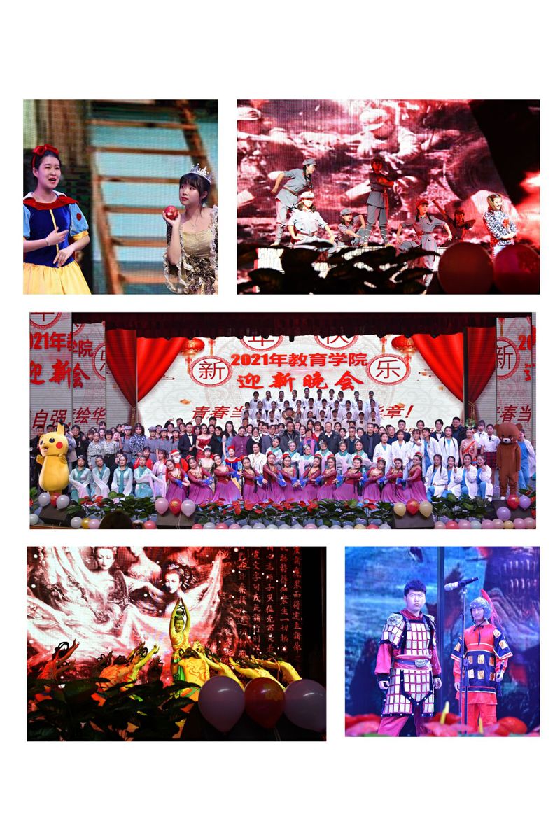 为喜迎元旦佳节,欢迎2020级新同学,教育学院“青春当自强,接续绘华章”2021年迎新晚会于2020年12月23日晚在实验剧场隆重举行。校党委委员、副校长张兆勤,学校相关部门负责人、教育学院领导班子成员及部分教师、学生近500人观看了晚会。