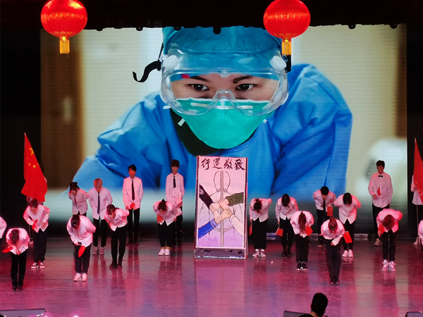 晚会由戏剧影视班同学表演的《哪咤》拉开序幕,魅惑的灯光和令人振奋的音乐为晚会的进行营造了热烈的氛围。二人合唱曲目《男孩》得到了同学们的欢呼和掌声。诗朗诵《致敬逆行》同学们饱含深情地歌颂着抗击新冠疫情中不顾自身安危奋斗在一线的白衣天使。小品《上学那些事》让观众感受到同学们出神入化的演技,令观众捧腹大笑。每个班拿出的节目都精彩至极,场下观众掌声不断。