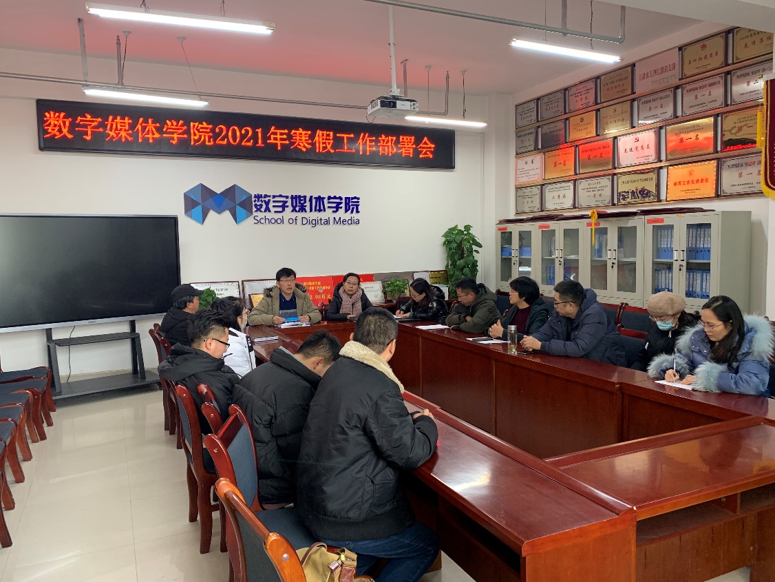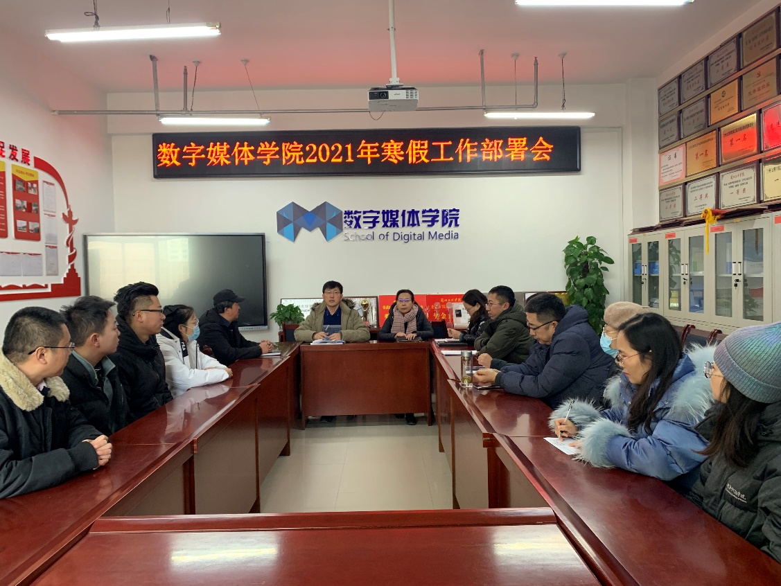 1月14日上午,数字媒体学院召开2021年寒假工作部署会议,学院院长李恒杰、学院党总支书记陈小琴、副院长黄珍、学院办公室主任高毅、实验中心主任洪晓芬、校企合作办主任蔺国梁、各教研室主任及坐班人员参加会议。