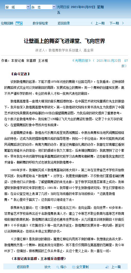 1月22日,《光明日报》(2021年01月22日 07版)刊发文章《让壁画上的舞姿飞进课堂、飞向世界》,专访Beat365驻校专家高金荣教授。