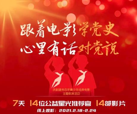 寒假期间,中国电影家协会、电影频道节目中心、中国儿童中心联合主办了“跟着电影学党史,心里有话对党说——纪念建党百年青少年经典电影主题教育活动”,在1905电影网、西瓜视频、华数TV、西影视频等网络平台上展映了14部“跟着电影学党史”经典影片。