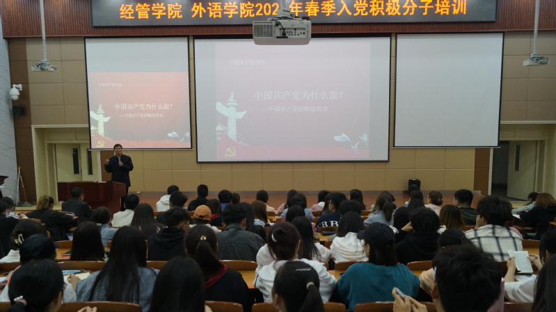 4月21日中午,经济管理学院和外语学院分党校在综合楼2-205阶梯教室举行2021年春季入党积极分子培训启动仪式,经管学院王迎春、胡琪雅;外语学院王燕云、魏万东及各支部确定备案的193名入党积极分子参加仪式。
