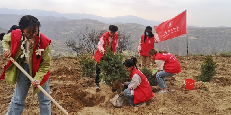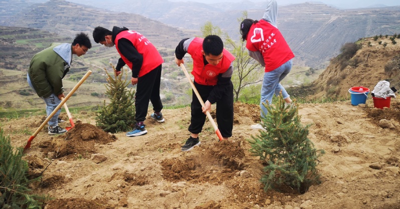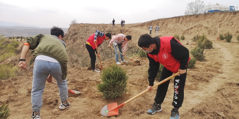 志愿者们迎着风沙,不怕苦、不怕累,大家分工明确,相互协作,三两成组,扶直苗木、挥锹填土、压平踏实、整培围堰,每一道工序都做得认真细致,接连栽下一棵棵树种,植树现场一派火热繁忙的劳动景象。经过3个小时的辛勤劳动,志愿者们完成了栽植任务。一棵棵新栽的树苗错落有致、迎风挺立,沐浴着和煦的春风,绽放出勃勃生机,为黄土高坡增添了更多绿意。