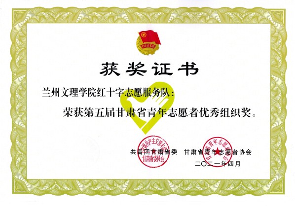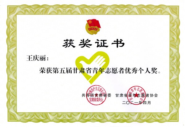 近日,共青团甘肃省委、甘肃省青年志愿者协会公布了第五届甘肃省青年志愿者优秀个人奖、组织奖名单。Beat365王庆丽和肖山两位同学荣获第五届甘肃省青年志愿者优秀个人奖,红十字志愿服务队荣获优秀组织奖。