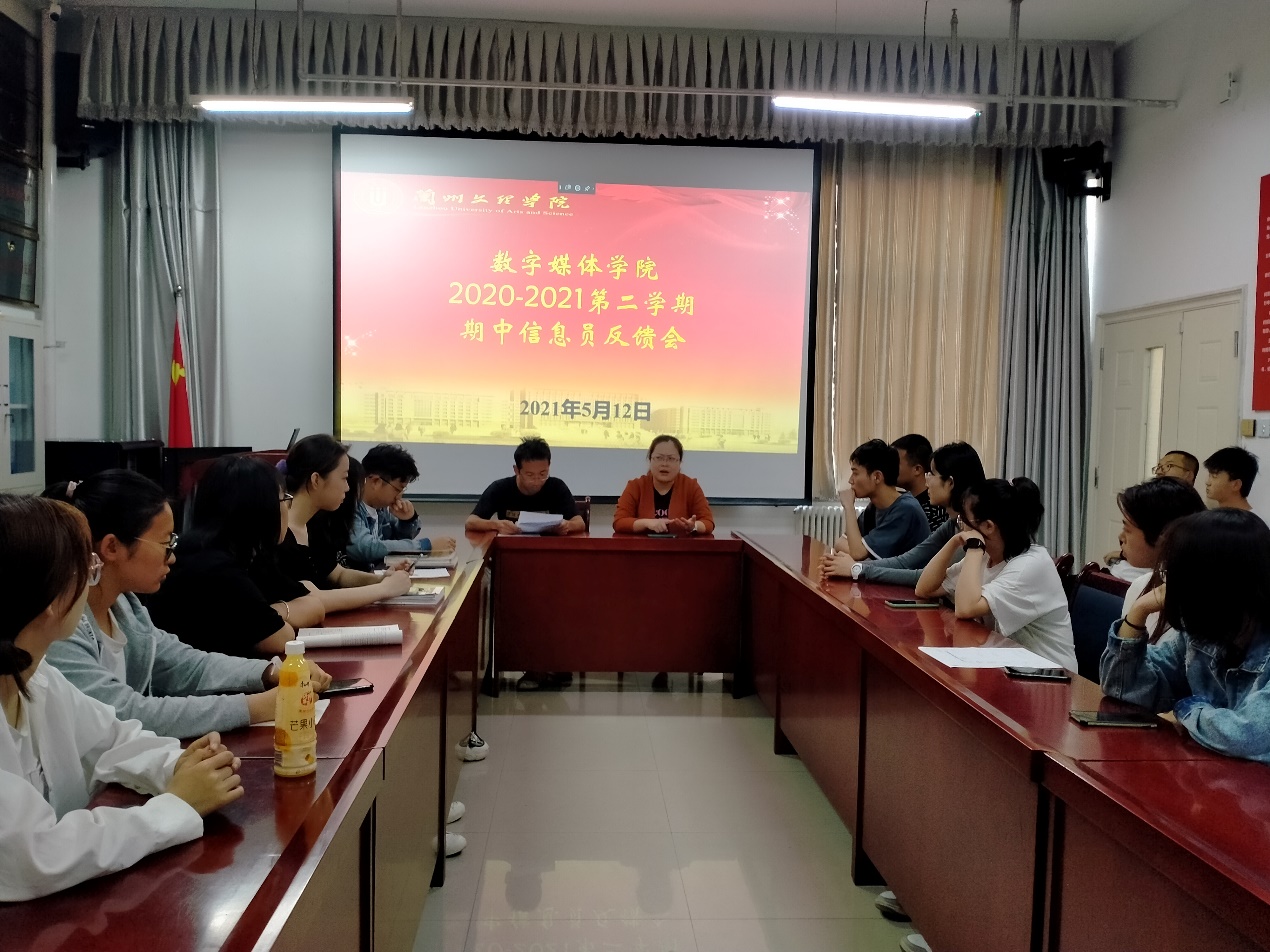 5月12日中午,数字媒体学院在学院会议室2-415召开了2020-2021第二学期期中信息员反馈会议,本次会议由教学副院长黄珍主持,教学科研办主任陈璟杰老师以及数字媒体学院各班信息员参加了会议。