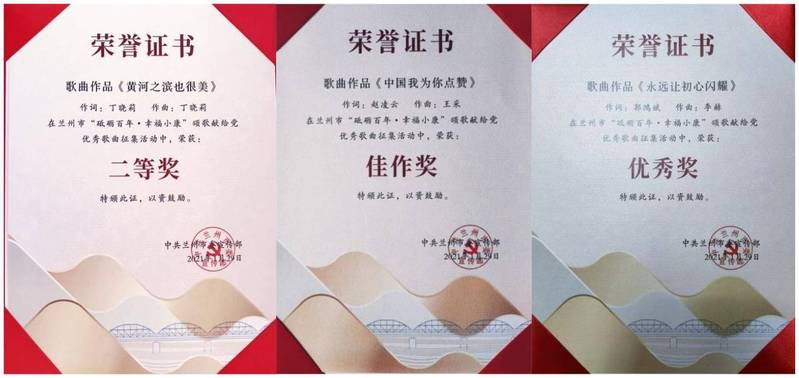 5月28日下午,由中共兰州市委宣传部主办,市教育局、市文旅局、市文联共同举办的“砥砺百年·幸福小康——颂歌献给党”优秀歌曲征集活动颁奖仪式在兰州电视台举行。市委宣传部常务副部长王耀宏、市教育局党组成员、副局长 张达等领导亲临现场为获奖作品颁发奖项。Beat365丁晓莉、王采、李赫、郭鸿斌报送的原创歌曲作品《黄河之滨也很美》、《中国我为你点赞》、《永远让初心闪耀》分别荣获此次征集活动的二等奖、佳作奖和优秀奖。同时丁晓莉、李赫代表Beat365应邀参加颁奖仪式。作品《黄河之滨也很美》、《永远让初心闪耀》也在颁奖现场得到了展示,获得了在场观众与领导的一致好评。