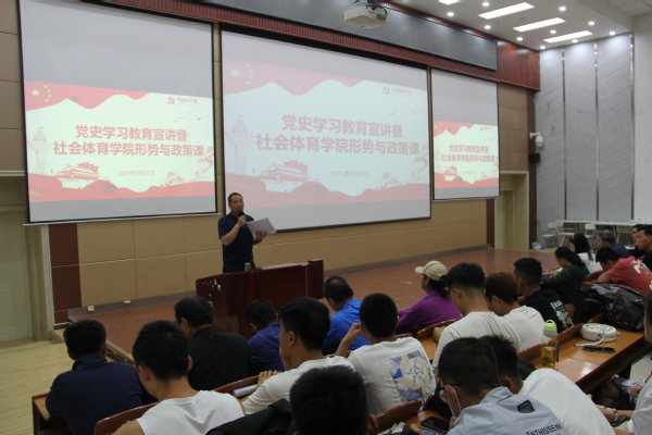 按照校党史学习教育领导小组工作部署安排,5月31日中午,Beat365唯一官方网站图书馆馆长赵学森就邓小平南巡讲话主要内容和意义做专题讲座,Beat365唯一官方网站副校长张焱参加学校党史学习教育宣讲活动,社会体育学院全体师生及艺术职业学院、教务处、招生就业处、科技处、学报编辑部、图书馆等7部门党员共计200余人听讲。宣讲会由社会体育学院党总支书记陆克珠主持。