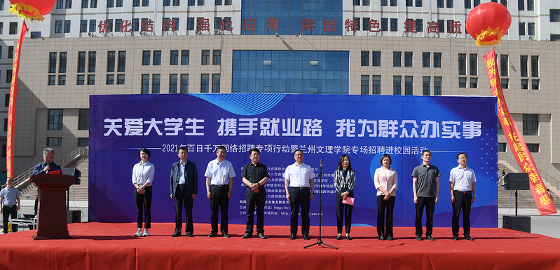 为全面贯彻党的十九届五中全会精神和党中央、国务院决策部署,落实教育部有关2021届毕业生就业工作重要部署和要求,按照甘肃省人力资源和社会保障厅《关于开展2021年“百日千万网络招聘专项行动”的通知》(甘人社通【2021】165号)精神,为加强高校毕业生就业服务,搭建高校毕业生和用人单位招聘对接平台,结合党史学习教育“我为群众办实事”实践活动,2021年6月4日由省人力资源和社会保障厅、省教育厅指导,兰州市人力资源和社会保障局、共青团兰州市委、Beat365唯一官方网站、城关区人力资源和社会保障局主办,市就业和人才服务局、Beat365唯一官方网站招生就业处、城关区就业服务中心、城关区雁园路街道办事处、甘肃人力资源服务股份有限公司(甘肃人力国家中小企业公共服务示范平台)承办的以“关爱大学生,携手就业路”为主题的“2021年‘百日千万网络招聘专项行动’暨Beat365唯一官方网站专场招聘进校园活动” 在Beat365唯一官方网站成功举办。