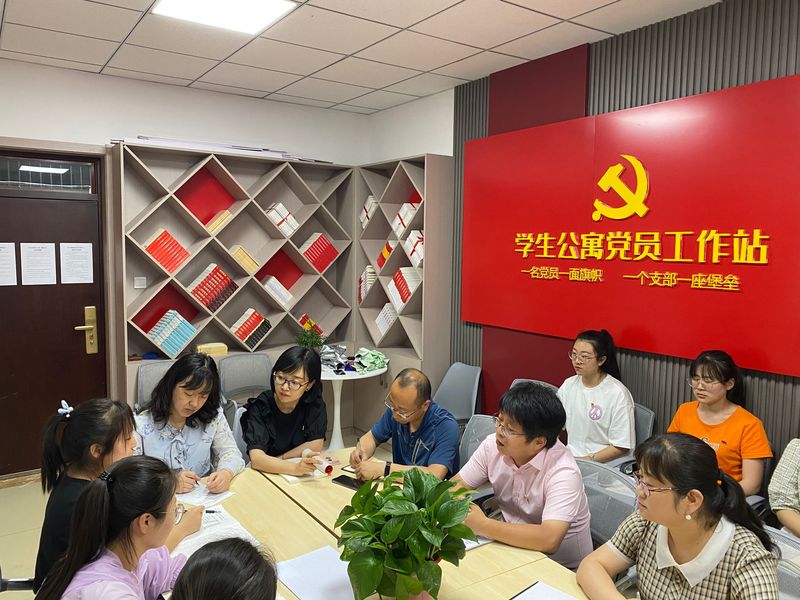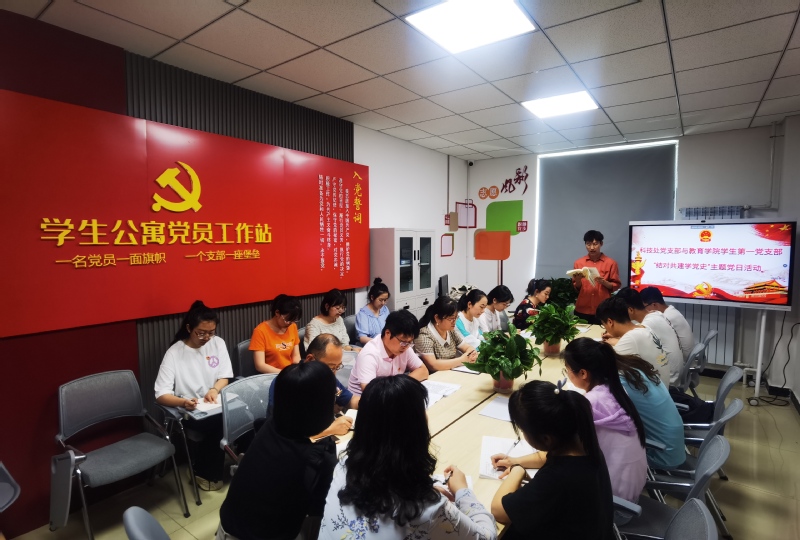 根据学校机关党委党史学习教育工作安排,为进一步推进党史学习教育走深走实,不断深化“为党旗添彩、为师生办实事”实践活动,坚持用心学党史、用情做实事,提升机关党支部政治功能和组织力,全面落实立德树人根本任务,发挥机关党支部和党员在大学生思想政治工作中的积极作用,架设起学生与机关党员干部沟通的桥梁,实现机关部门与二级学院党建工作相互促进、共同提升,搭建党建育人、思想育人、文化育人立交桥,扩展“三全育人”新格局,以共建活动促进机关部门与二级学院党建工作提质增效。科技处党支部联合教育学院学生第一党支部于2021年6月10日中午在南校区新建学生公寓党员工作站开展“结对共建学党史”主题党日活动。本次活动由教育学院学生第一学生党支部书记曲丽蓉主持,教育学院党总支书记张莉带领支部学生党员、科技处党支部书记陈兵建携支部全体党员全程参加活动。