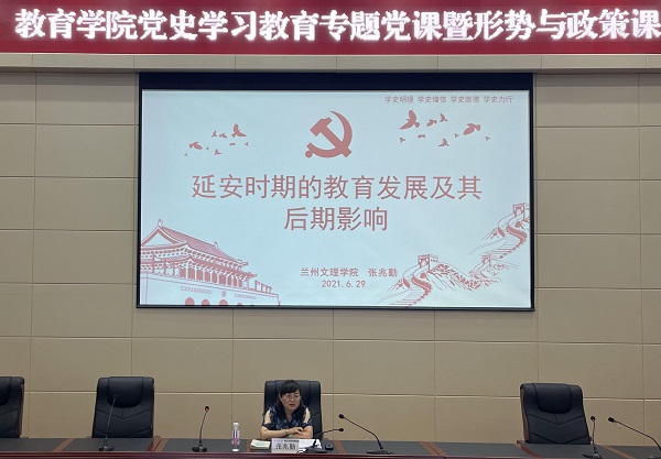 2021年6月29日中午,校党委委员、副校长张兆勤同志在学术报告厅做《延安时期的教育发展及其后期影响》主题党课暨形势与政策专题讲座。校财务处、国资处、招标办、音乐舞蹈学院党员干部及教育学院班子成员、教师党员及学生代表共二百余人参加,讲座由教育学院党总支书记张莉主持。
