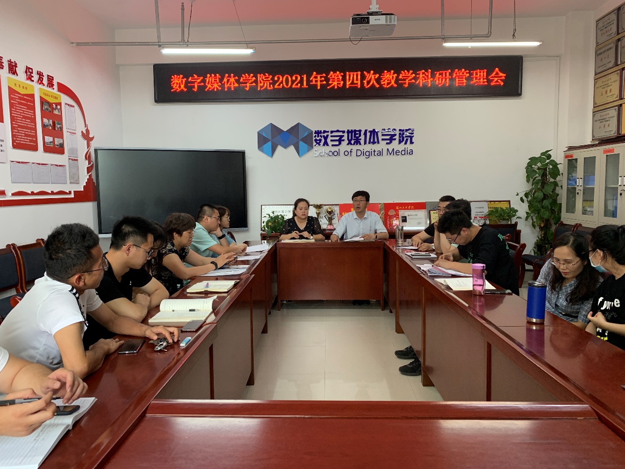 7月1日下午,数字媒体学院在会议室召开2021年第四次教学科研管理会。院长李恒杰、副院长黄珍出席并主持会议,学院各教研室主任、校企合作办主任及教学科研办、实验中心、学院办公室全体人员参加会议。