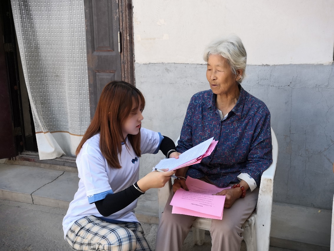 图为实践团队队长马晓燕同学帮助不识字的村民做问卷调查