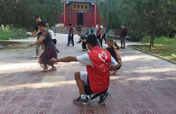 当地的一位王阿姨说,她们年纪大了,身体也越来越差,找不到合适的健身方式。为此,在王阿姨的的帮助下,实践队员们召集了当地对武术感兴趣的老人们,给他们教了一套强身健体的武术拳。阿姨们学的一个比一个认真,怎样出拳,如何踢腿,在一片乐呵呵的氛围中,阿姨们学会了这套武术拳法,还相互进行了切磋。