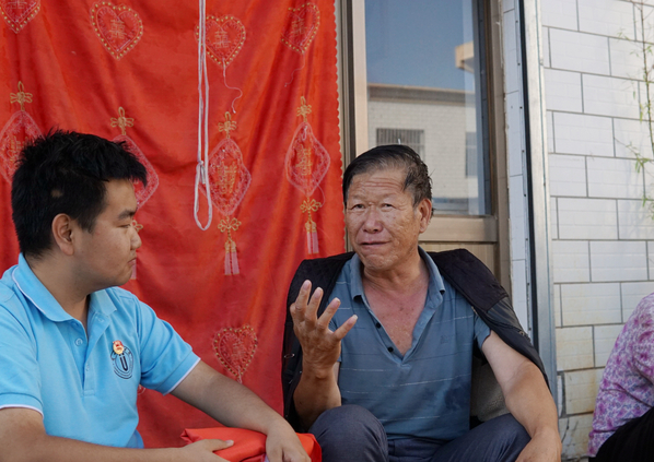 在大滩村309国道沿线的一家商店,宣讲队员向经营者郭小燕及其母亲讲起乡村振兴战略,结合走访调研获取到的当地发展举措与成效,用最朴实的话语向大家解释什么是“产业兴旺、生态宜居、乡风文明、治理有效、生活富裕” 。